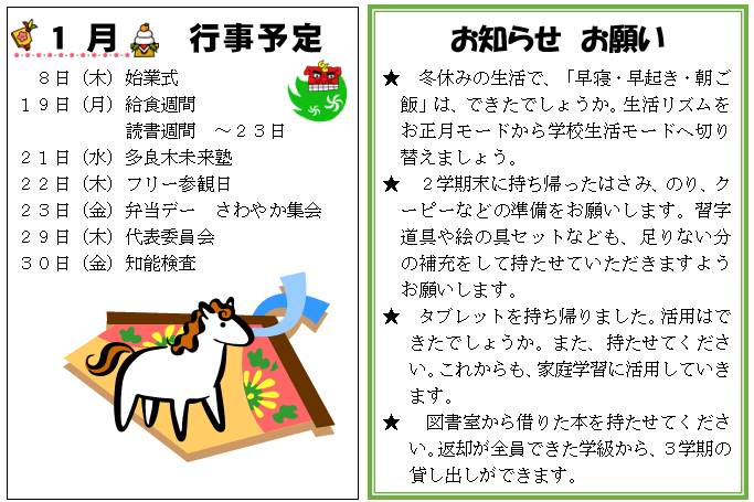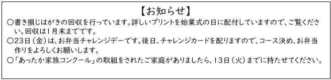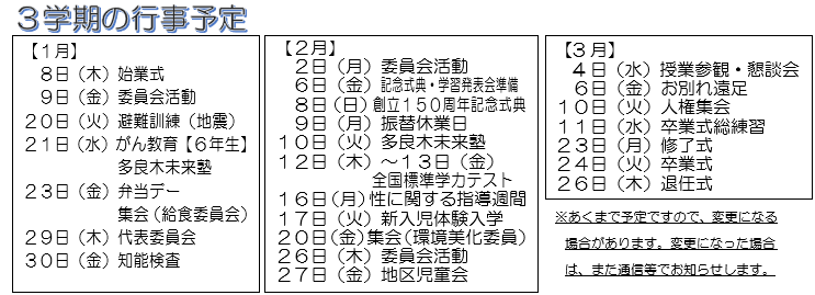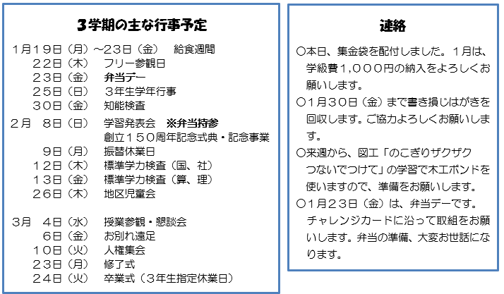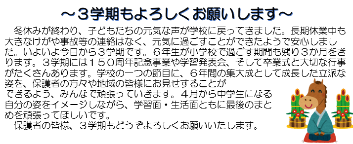 保護者の皆様には、3学期も様々な面でご協力いただくことがあると思いますが、どうぞよろしくお願いします。