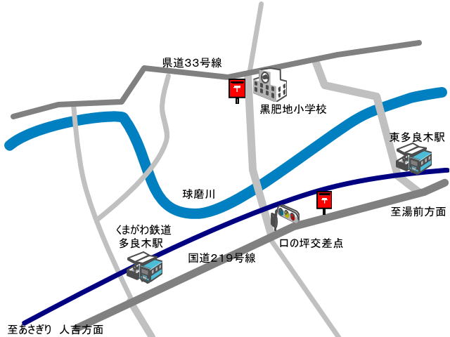 | 自動車利用 | 人吉インターチェンジ → 県道33号線 → 黒肥地小へ(約35分) |