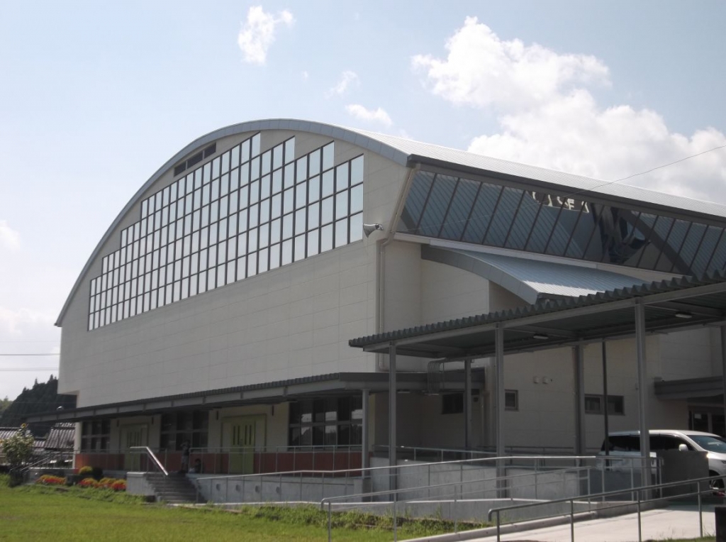 運動場から見た体育館です。遠くからでもよく目立ちます。梅田先師の記念碑です。