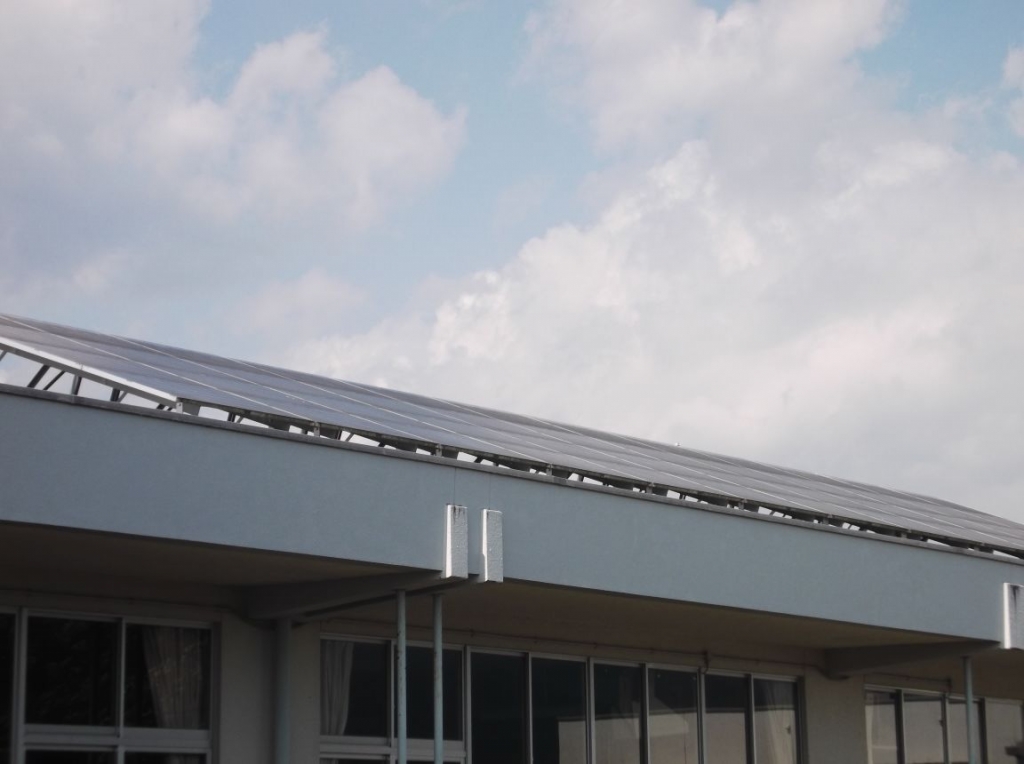 屋根の上に太陽光発電システムがあります。飼育小屋にはウサギがいます。