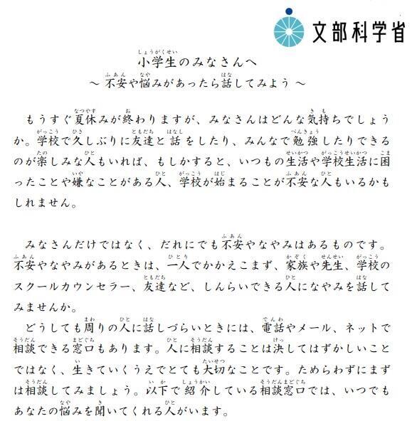 これらのことを踏まえ、下記のとおり、学校として、保護者、地域住民、関係機関等と連携の上、長期休業の開始前から長期休業明けにおける児童生徒の自殺予防に向けた取組に全児童生徒の自殺は学校の長期休業明けの時期に増加する傾向があることを踏まえ、保護者、地域住民、関係機関等と連携の上、児童生徒の自殺予防に係る取組を実施していただくようお願いいたします。