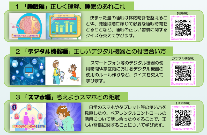(2)「くまもと携帯電話・スマートフォンの利用5か条」や「親の学び」オンデマンド講座DVDを活用し、デジタル機器の使用に加え、インターネットやSNS等の適正利用に関するルールづくりを呼びかけること。