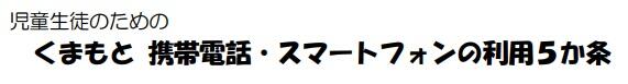 携帯電話・スマートフォンの利用について、各学校や地域で、それぞれに話し合い、ルールづくりの取組みが始まっています。熊本県教育委員会では、これらの自主的な取組みを促進していきたいと思います。そのため、皆さんで取り組んでほしいこととして、「くまもと 携帯電話・スマートフォンの利用 5か条」を取りまとめました。これを