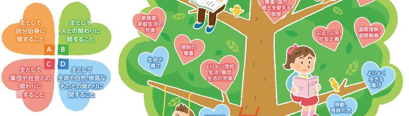 道徳科で学習する内容は,児童生徒の道徳性を次のA~Dの4つの視点から捉え,右の♡のような内容項目を学習することになっています。※小学校の内容項目を表したものです。