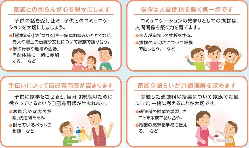 (1)保護者に対し、家庭教育広報資料を活用して、家庭教育の重要性の啓発に努めること。また、児童生徒が家庭の一員として自らの役割と責任を自覚し、充実した生活が送れるように支援していくこと。