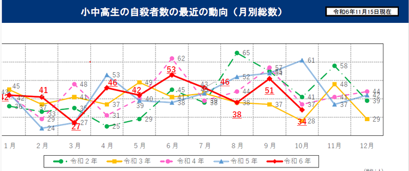 警察庁・厚生労働省の自殺統計によると、令和5年の児童生徒の自殺者数は513人と、過去2番目に多い件数となり、大変憂慮すべき状況にあります。また、令和6年の児童生徒の自殺者数は、1月から10月までの暫定値で420人(令和5年同期間:434人)という状況にあります。