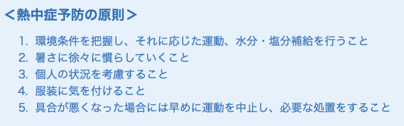 熱中症事故は体育、スポーツ活動だけでなく、部活動、屋内での授業中、登下校中においても発生しており、教育課程内外を問わず適切な熱中症の防止措置をとることが必要です。また、それほど高くない気温(25~30℃)の時期から適切な措置を講ずることや、気象状況や空調設備等の整備状況等を踏まえて活動内容を設定することも重要です。