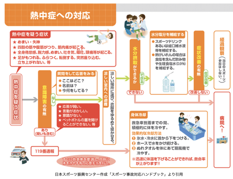 今年度は、昨年度に比べ様々な活動が幅広く展開されることが見込まれます。熱中症の疑いがある症状が見られた場合には、早期の水分・塩分補給、体温の冷却、病院への搬送など適切な処置を行ってください。