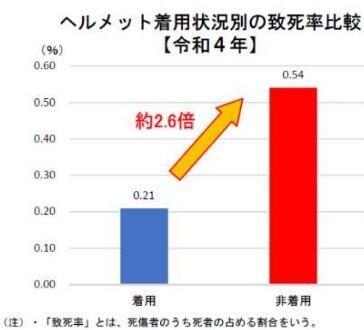 警察庁の情報によると、過去 10 年間の死傷者全体のヘルメット着用率はおよそ 10%未満で推移していました。また、令和 4 年のヘルメットの着用状況別の致死率をみると、ヘルメットを着用していなかった場合は、着用していた場合に比べ、致死率が約 2.6 倍という統計結果でした。