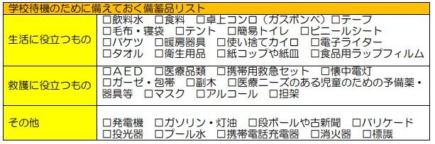 災害によっては、引き渡しも困難な場合があるため、そのまま、学校に留まることもありうる。この場合、宿泊することも想定し必要な備蓄について表にまとめ準備する(参考)。