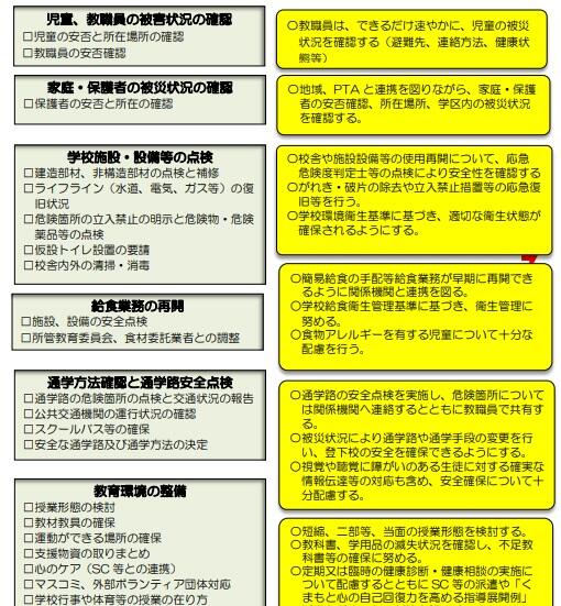 (1) 学校管理下での地震・土砂災害等の発生時における対応策について教職員の役割等を明確にし、学校防災体制を確立する。(学校保健安全法第29条 以下「保安法」)