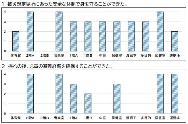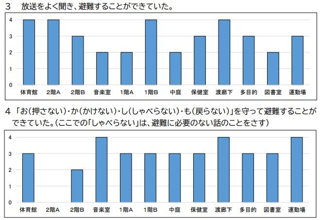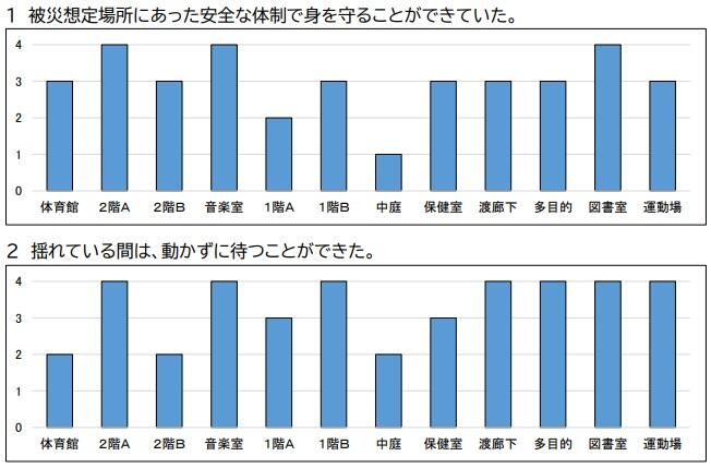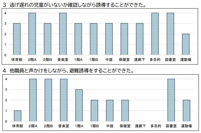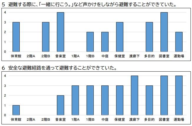 今回は文部科学省発行の「実践的な防災教育の手引き」(令和5年3月)を参考に「職員の評価」を取り入れました。評価の視点は、①児童の避難の仕方の評価、②職員自身の誘導や安否確認評価の2つです。