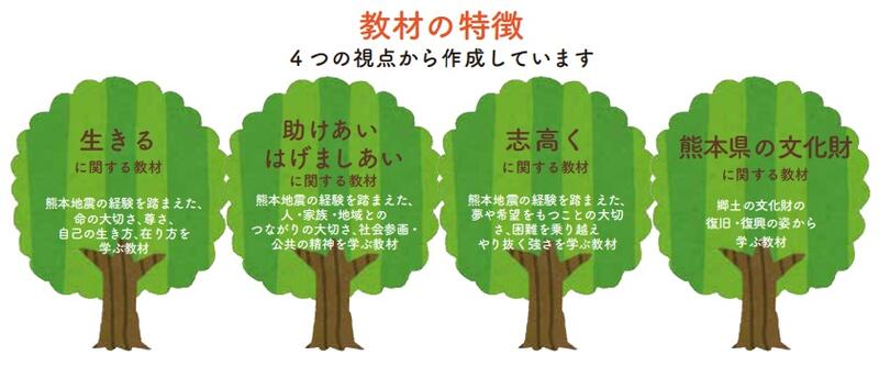 熊本地震後に、「つなぐ~熊本の明日へ~」が発行されました。この本は、私たちの大切なふるさと熊本の姿を一変させた平成28年熊本地震でのみんなの思い、願い、そして、姿を教材化したものです。