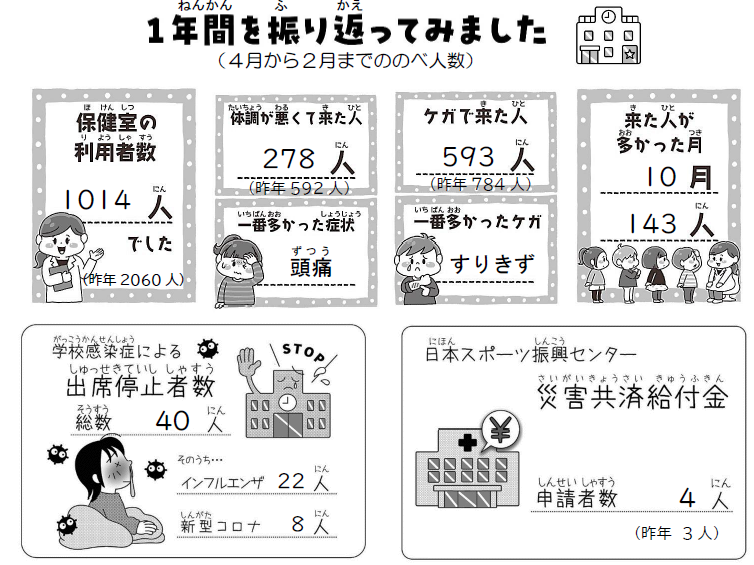 今年は、昨年と比べて、保健室利用者数も減少し、大きなけがも少なかった一年でした。