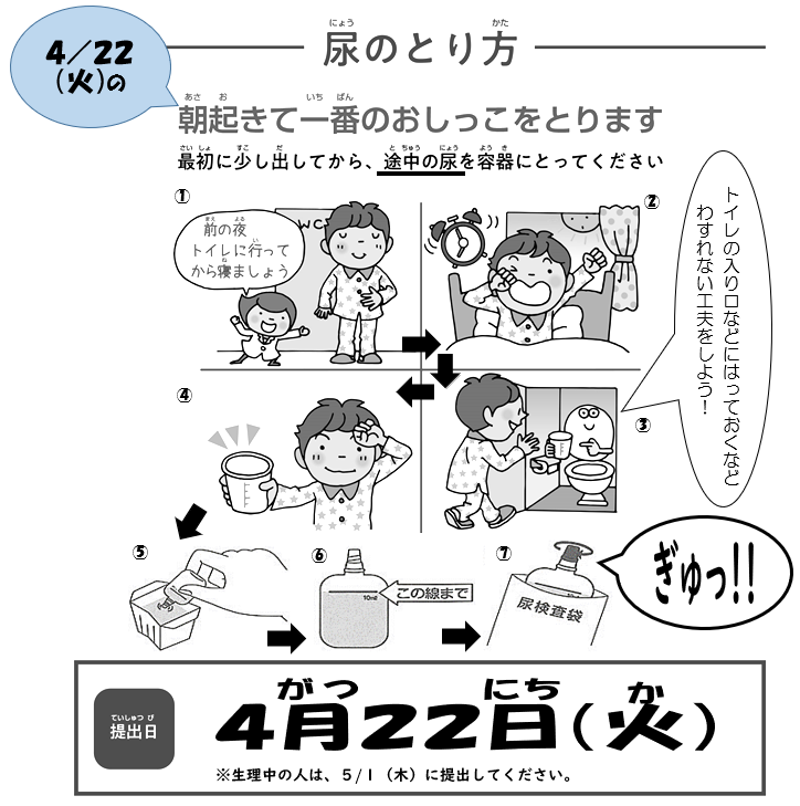 ・尿検査・・・・・・おしっこに、たんぱく・糖・血液がまじっていないか。