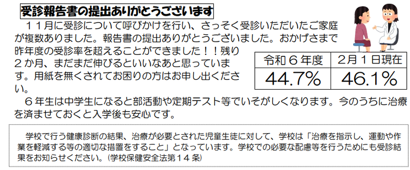 1学期に行った健康診断で受診が必要なご家庭には、健診直後と10月に受診のお知らせをお渡ししておりますが、受診はお済みでしょうか。年末年始は医療機関が休診となりますので、できるだけお早めに歯科や眼科等への受診をお済ませください。