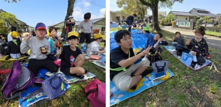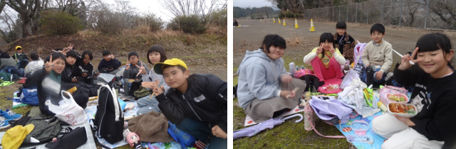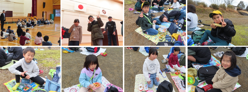 先日のチャレンジ弁当は、ご協力ありがとうございました。お休み明けで、大変だったかもしれませんが、みんな何かしらお手伝いができていたようでした。この日はお天気もよく、3年生は外で食べようということになり、青空のもと黒っ子山でなかよくお弁当タイムを楽しみました。1年生は、教室でみんなと円になって食べました。(わかくさ学級通信から)