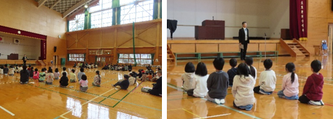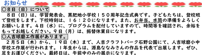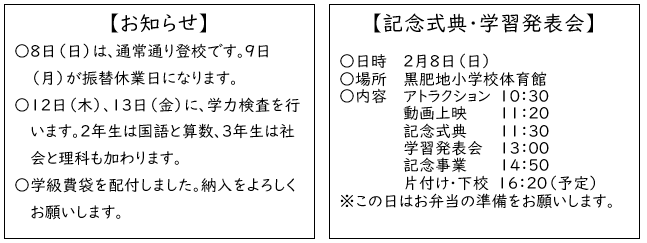 2月20日(火)に来年度入学してくる子どもたちが体験入学に来てくれました。6年生の代表児童が、黒肥地小学校のいいところや行事について紹介しました。(6年生学級通信から)