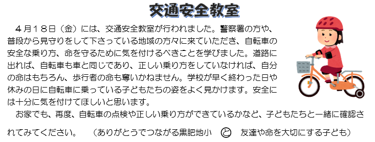 17日(水)に交通安全教室を行いました。警察署の方や交通指導員の方々にご指導いただき、自転車の安全な乗り方や交通ルールなどについて学びました。遊びに行くときなど、自転車で外出する児童が多いようなので、今回学んだことをしっかり守り、安全に自転車に乗ってほしいと思います。自転車の運搬等、保護者の皆様のご協力、ありがとうございました。また、19日(金)には、多良木町危機管理防災課の方を講師にお招きし、防災教室を行いました。ハザードマップの確認やマイタイムラインの作成などを通して、防災への意識を高める貴重な機会となりました。(5年学級通信より)