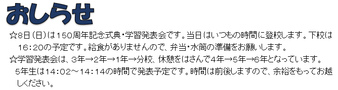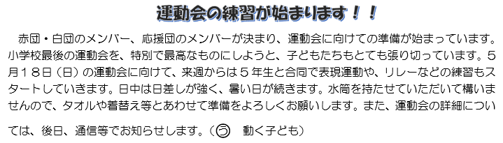 ひとつ大きな行事が終わりましたが、この運動会を通して、一人一人が成長し、団結力も高まったことだと思います。今回の経験を生かして、これからも、高学年らしく、学校を引っ張ってほしいと思います。次は、集団宿泊教室を目標に気持ちを高めていきます。(5年 学級通信より)