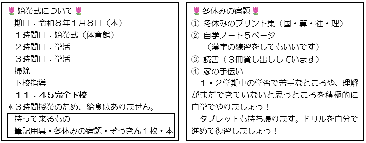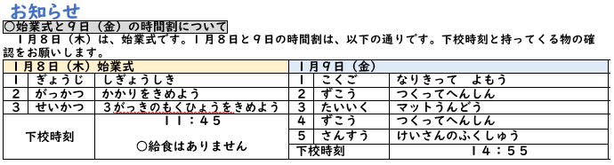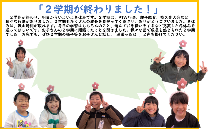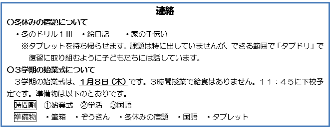 2学期の終業式で約束した「命を大切にして、3学期の始業式は全員が元気に登校する」ことが守られたこと。休み中に大きな事故や病気の連絡もなく今日を迎えられたことを嬉しく思う。
