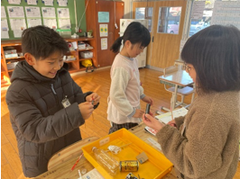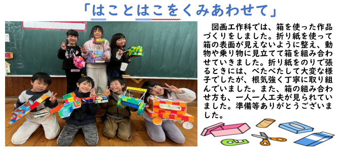 これまでに新入児体験入学に向けて、名札や学校探検カード、楽しめる活動などを話し合い、計画してきました。子どもたちはとても楽しみにしていました。いざ、体験入学が始まると、少し緊張した様子でしたが、一緒に活動していく中で、表情も和らぎ、お兄さん、お姉さんらしい姿になっていきました。新入児のみんなも笑顔で過ごしていたのでよかったです。来年度の一年生が楽しく登校できるように、6年生としての自覚をもって、これから過ごしてほしいと思います。(5年生学級通信から)