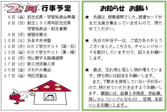 中間報告の集会では、「80点」と発表しました。2月は残り半分ですが、100点を目指してほしいと思います。(わかくさ学級通信)