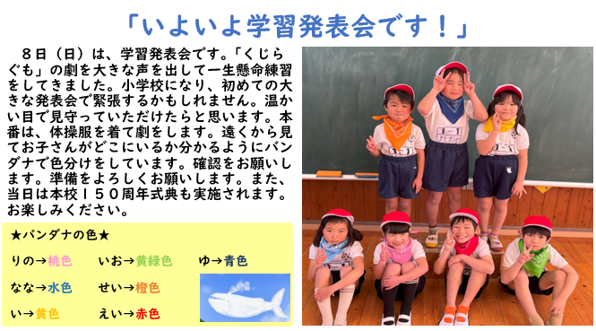 19日(日)の運動会、お世話になりました。子どもたちにとっては、小学校に入って初めての運動会でした。学校生活に少し慣れてきたかと思ったらすぐ運動会の練習が始まり、体力的にも大変だったと思います。本番では、いつも以上に笑顔で踊り、走り、声を出す子どもたちの姿を見ることができて うれしかったです。