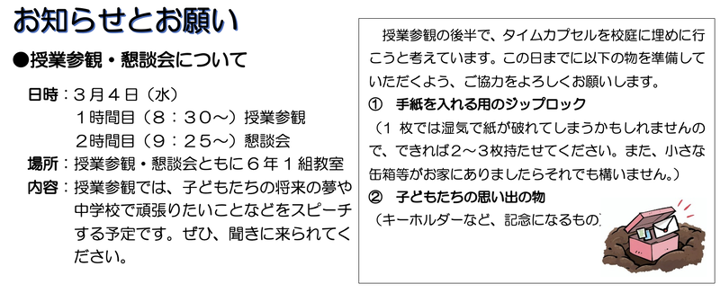 【期 日】3月4日(水) 授業参観 10:25~11:10