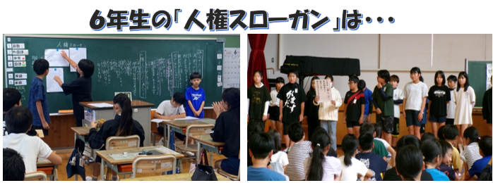 今週は人権週間でした。学級では、クラスの課題は何か、1年間を通してどのような学級にしていきたいのかをみんなで話し合いました。一人ひとり、たくさんのよさをもつ6年生ですが、友達の話を聞いて気持ちを想像することや、男女関係なく接していくことを意識して、よりよい学級にしていきたいという意見が出ました。みんなの意見を一つにまとめ、6年生の人権スローガンは「男女関係なく協力し合い、命を大切にする6年生」に決まりました。このメンバーで過ごすのも、今年が最後です。一人ひとりが輝き、安心して自分らしく生活できる、そんなクラスを子どもたちと一緒に作っていきます。(と:友達や命を大切にする子ども)