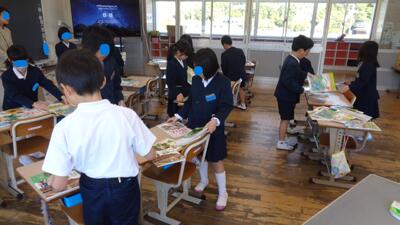 朝から、天草工業高校の生徒さんがボランティアで読み聞かせに来てくださいました。今日は、5、6年生が陸上記録会のため、1~4年生だけでした。各教室に4名ずつで読み聞かせをしてもらいました。子どもたちは、高校生ということでいつもと違う雰囲気でしたが、とても楽しそうでした。