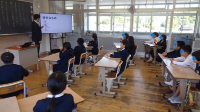 4時間目は、2年生が生活化で調べた楠浦町のすてきなところを、1年生に発表しました。2年生は、これまでに楠浦町を探検し、すてきなところをたくさん見つけてきました。それをチームごとにまとめ、1年生に伝えました。クイズなどを交えながら楽しい時間となりました。1年生は、2年生の良さを引きついて、自分たちの学びに生かしていきます。