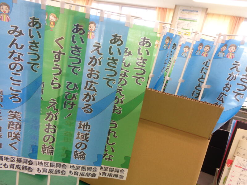 楠浦地区振興会が主催する、あいさつ運動推進標語に選ばれた標語が、のぼり旗となって学校にいただきました。