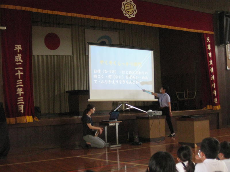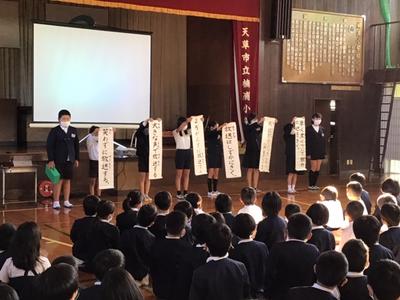 今日は図書委員会と放送委員会の発表が行われ、それぞれの委員会の日々の活動の様子が紹介されました。その後、教務主任の上田先生より学びの集会が行われ、授業における自分の考え方の「伝え方極意」を鬼滅の刃の主人公の技を例にとり、具体的に発表の仕方のデモンストレーションが行われました。自分の考えを伝わるように技を駆使して発表する事を今後、全学級で取り組んで行きたいと思います。