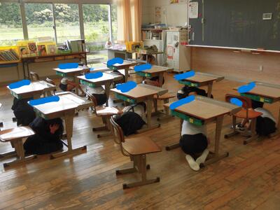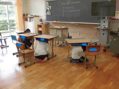 これは、訓練です。揺れを感じたら、机の下に潜り、頭を守ります。
