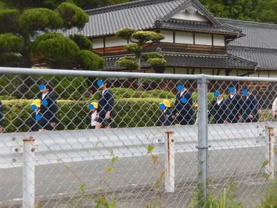 登校班での様子。黄色いジャケットと緑の帽子が地域の見守り隊です。国道沿いなので車も多く危険です。毎日、見守ってもらってます。