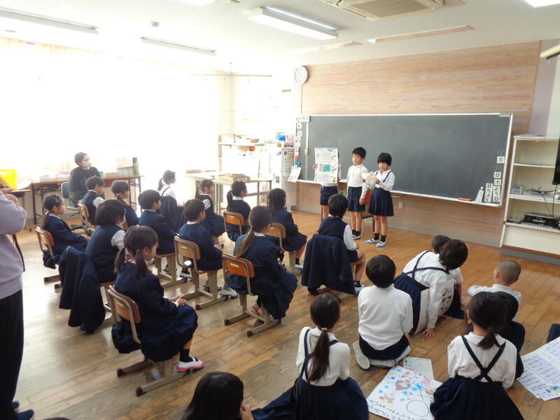 4時間目は、2年生が生活化で調べた楠浦町のすてきなところを、1年生に発表しました。2年生は、これまでに楠浦町を探検し、すてきなところをたくさん見つけてきました。それをチームごとにまとめ、1年生に伝えました。クイズなどを交えながら楽しい時間となりました。1年生は、2年生の良さを引きついて、自分たちの学びに生かしていきます。