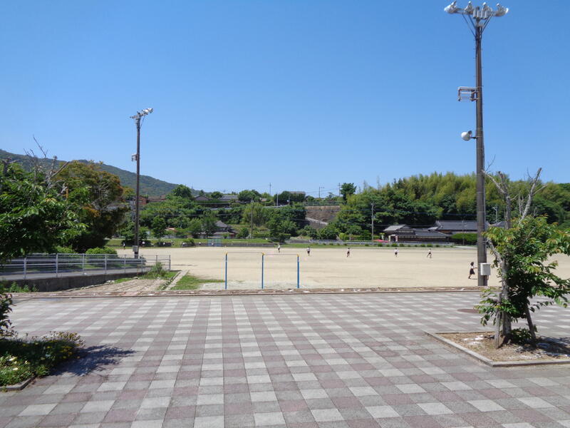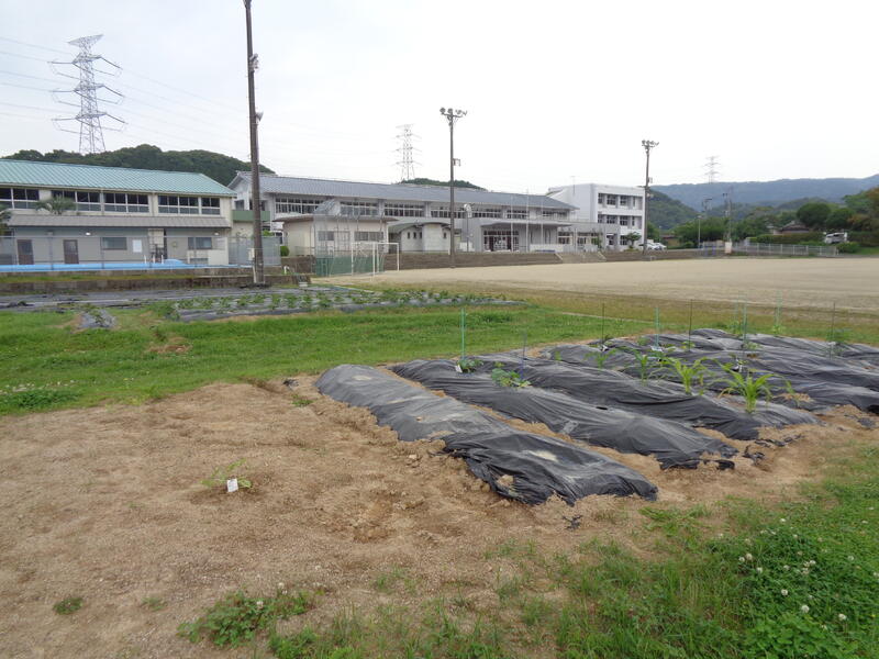 今日は少し曇っています。雨も少しぱらつき始めました。低学年が頑張って作っている畑の方から、学校全体の写真を撮ってみました。