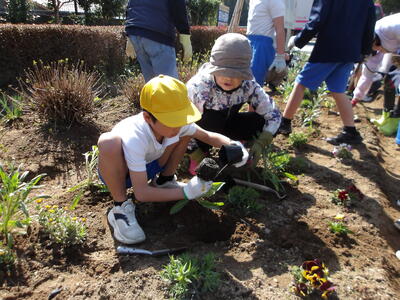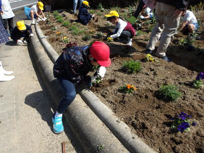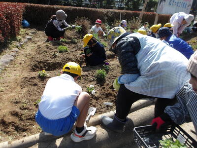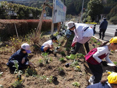 3月4日 1・2年生が地域の方々と一緒に葛渡駐在所前の花壇に花を植えました。