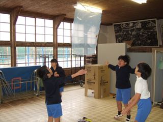 4年生で、気球を飛ばしました・・・といっても、ゴミ袋に簡易コンロを使って暖かい空気を送り込むだけですが・・・。