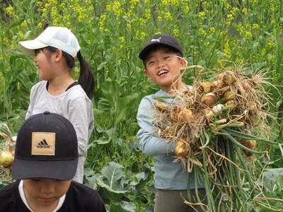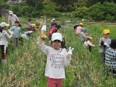 全児童で一斉に収穫開始。 「先生!獲れました!!」「大きいね(^_^)b」
