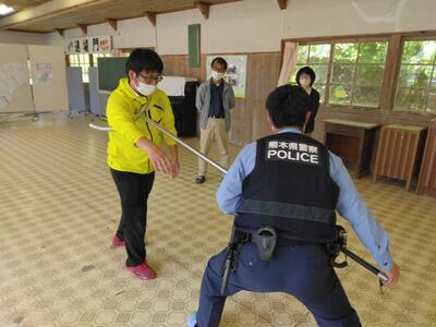 「さすまたは相手を押さえるというよりも近づいてくる不審者を遠ざけるために使います」職員にもご指導いただきました。