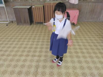 1年生と2年生合同で図工をしました。新聞紙がいろんな物に変身します。