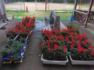 きれいに咲き続けてほしいな(´。`)と水をかける子どもたち。