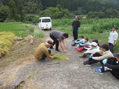 10月14日 地域やJAの方々のご指導で、5・6年生が稲刈り体験をしました。