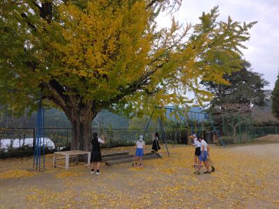 葛渡小のシンボルである万年樹(銀杏の木)が、たくさんの葉を落とす季節になりました。昼休みに一生懸命落ち葉を掃く(拾う)子どもたち。落ち葉はマットなど、遊び道具にも変身します!(^^)!