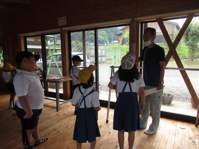 生活科の学習で、校区内にある葛彩館へ行ってきました。施設について、説明を聴く1・2年生児童。「なるほど、なるほど(@_@)」