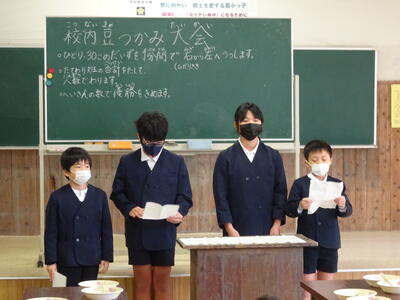 今回の児童集会は、給食・保健委員会による企画で「校内豆つかみ大会」でした。