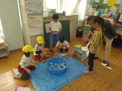 1・2年生は、久木野小1・2年生や西方寺子ども園の園児さん方をお招きして、出店祭りを開催しました。