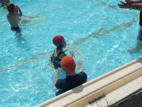 こちらが着衣水泳の様子です。3年~6年生までが服を着たままプールに入り、服が濡れた時の重さや、救助の方法を学びました。
